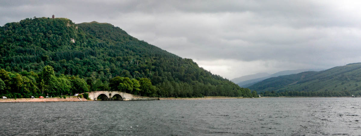 It was a beautiful morning, but we couldn’t hang around long enough to enjoy it. We noshed on apples and prepackaged blueberry muffins as the bus carried us through Glasgow – no time here, either, before switching lines. The route from Glasgow wound along the west shore of Loch Lomond. The scenery transformed – green, misty, mountainous. In Inverary, a small, pleasantly scenic town on Loch Fyne, the bus driver pulled over and gruffly suggested everyone stretch their legs.